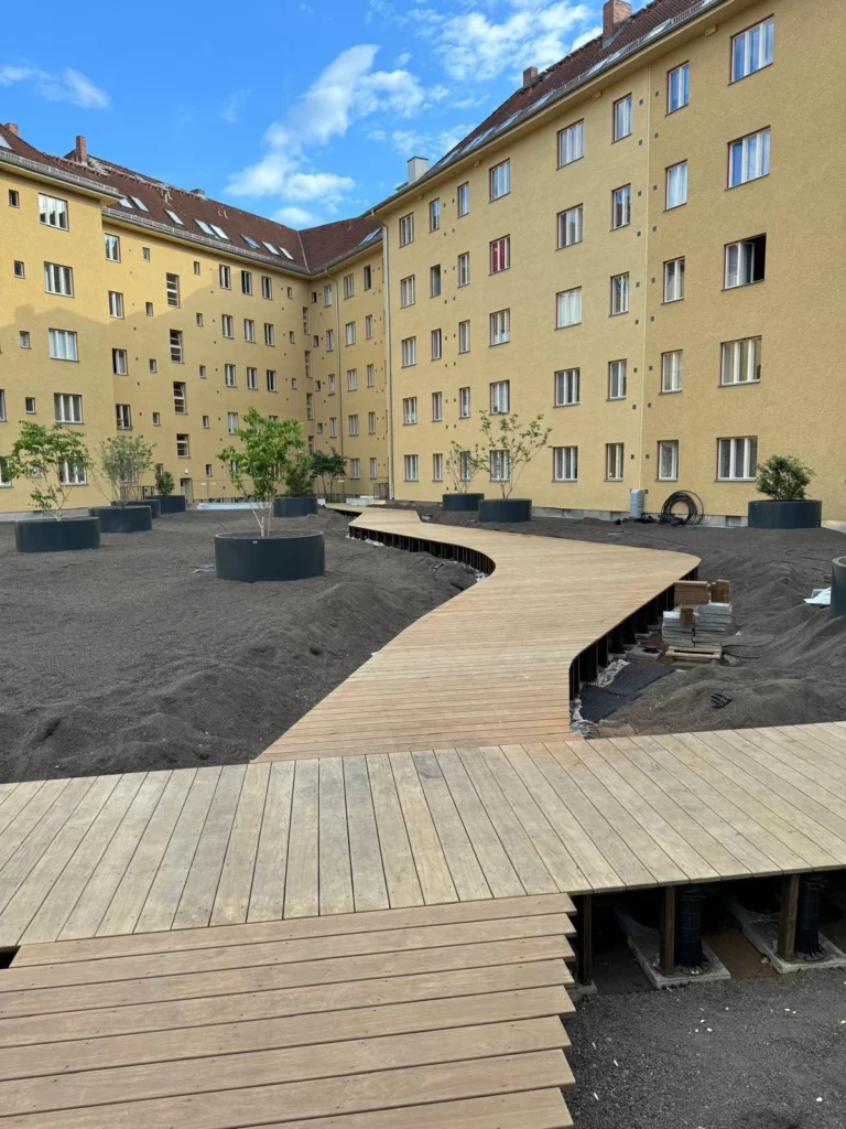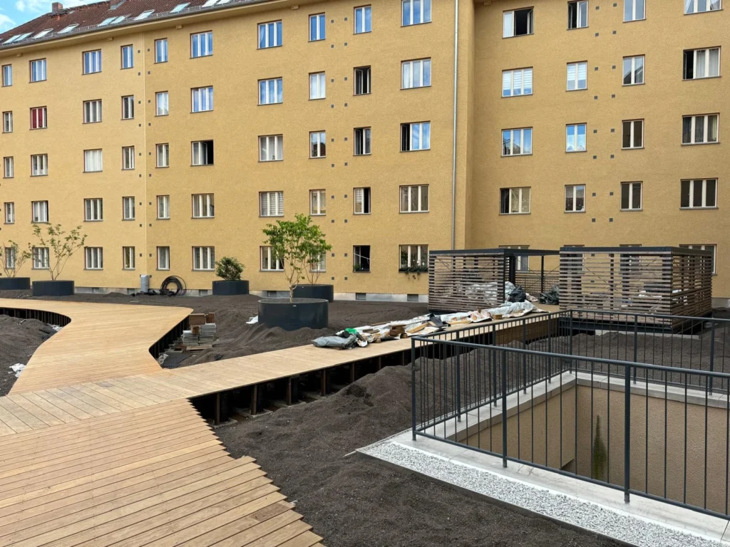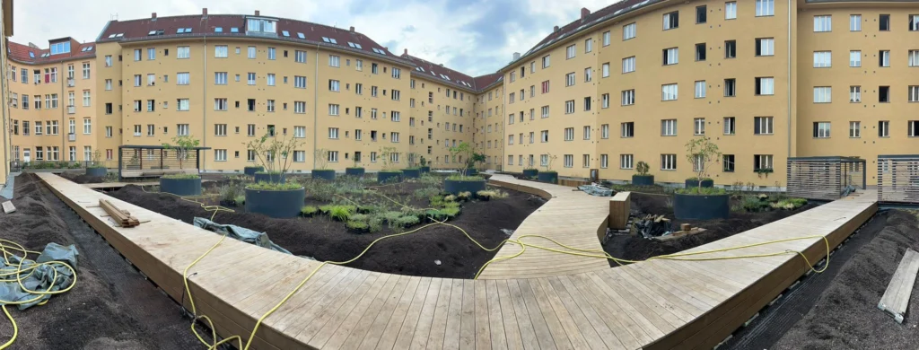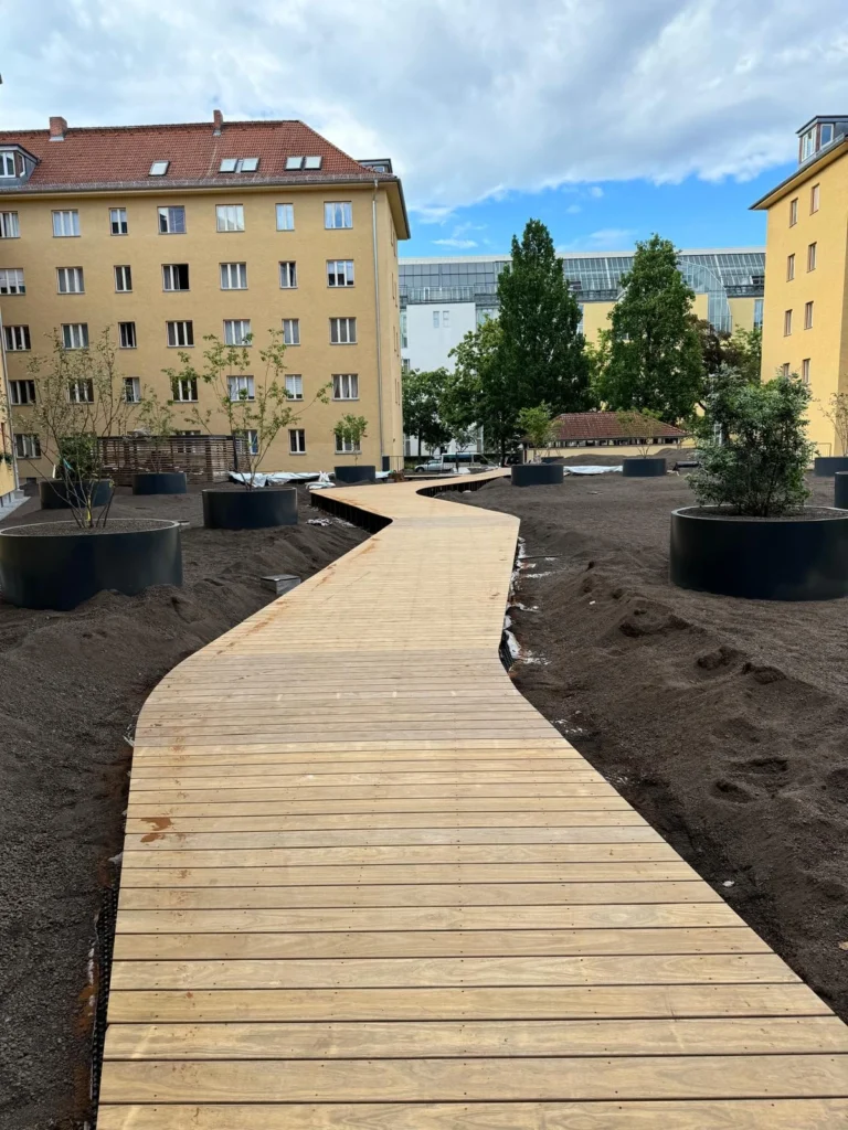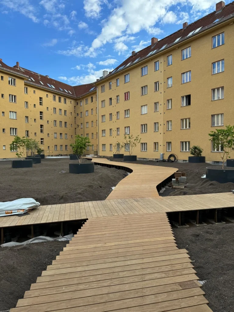 Przy ulicy Ahrweiler Str./Suedwestkorso w Berlinie dla największej spółdzielni mieszkaniowej w Niemczech wykonaliśmy w 2024 r kompleksowe zagospodarowanie terenu w tym: