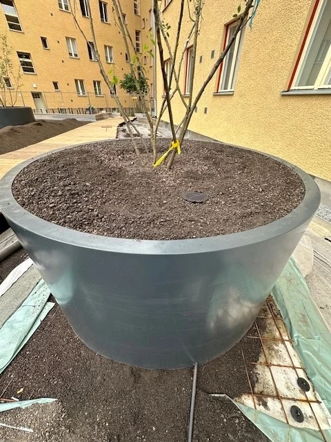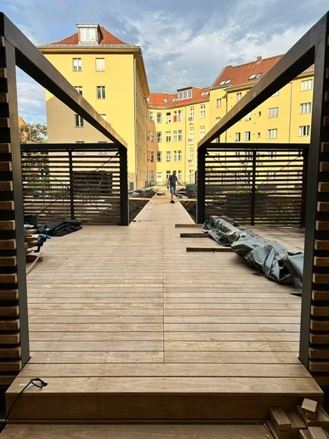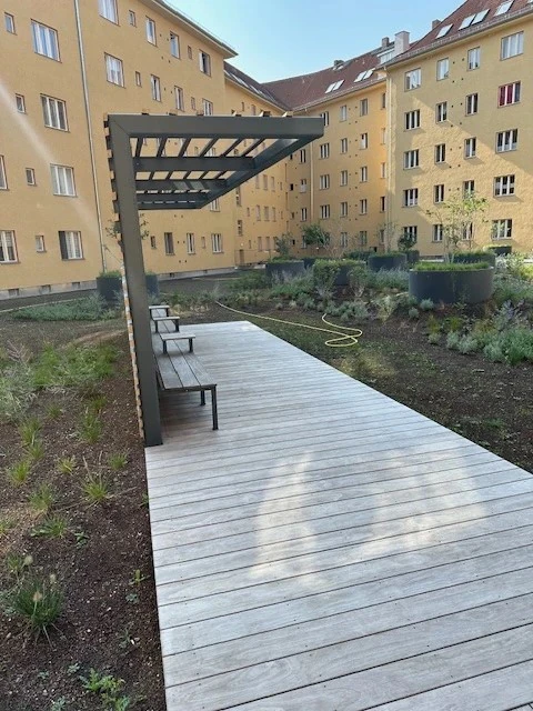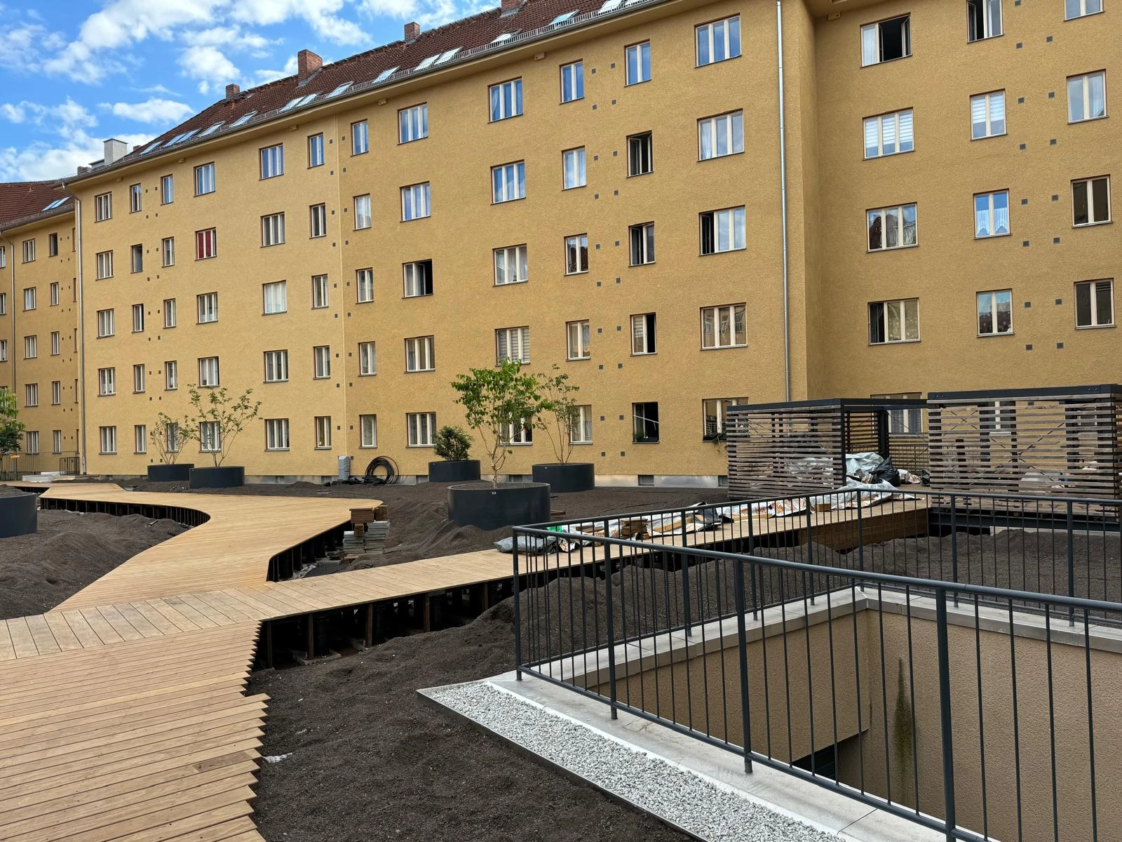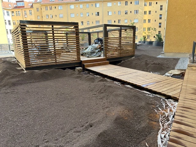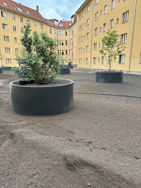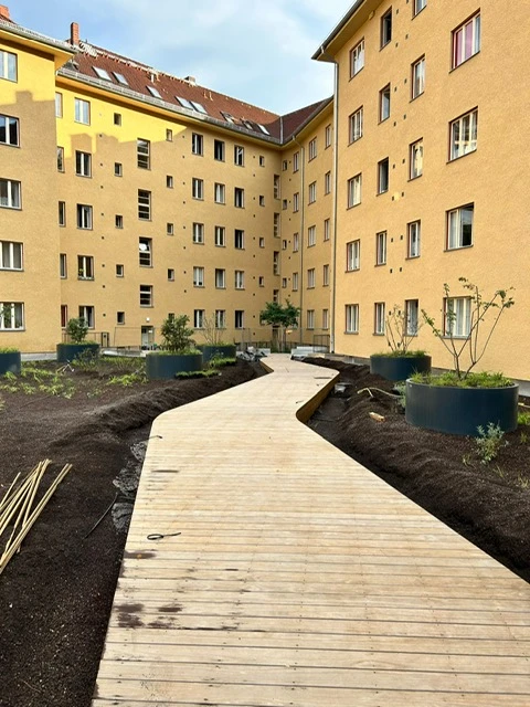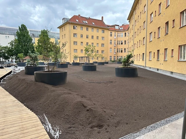 Przy ulicy Ahrweiler Str./Suedwestkorso w Berlinie dla największej spółdzielni mieszkaniowej w Niemczech wykonaliśmy w 2024 r kompleksowe zagospodarowanie terenu w tym: